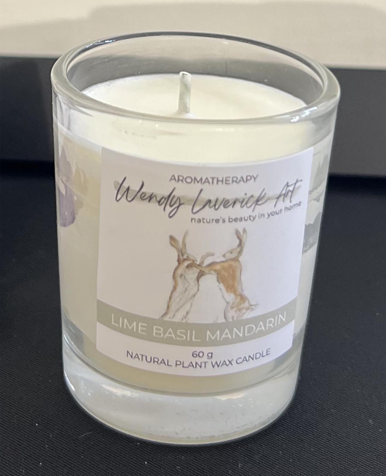Illuminate your space with the soothing essence of our Lime, Basil, Mandarin candle. Crafted from natural plant wax, this 60g candle not only enhances your decor but also fills your home with a rich, inviting fragrance. The artistic label, featuring a delicate illustration, reflects the beauty of nature, making it a perfect addition to any room. Experience the calming benefits of aromatherapy while enjoying a touch of elegance in your environment.