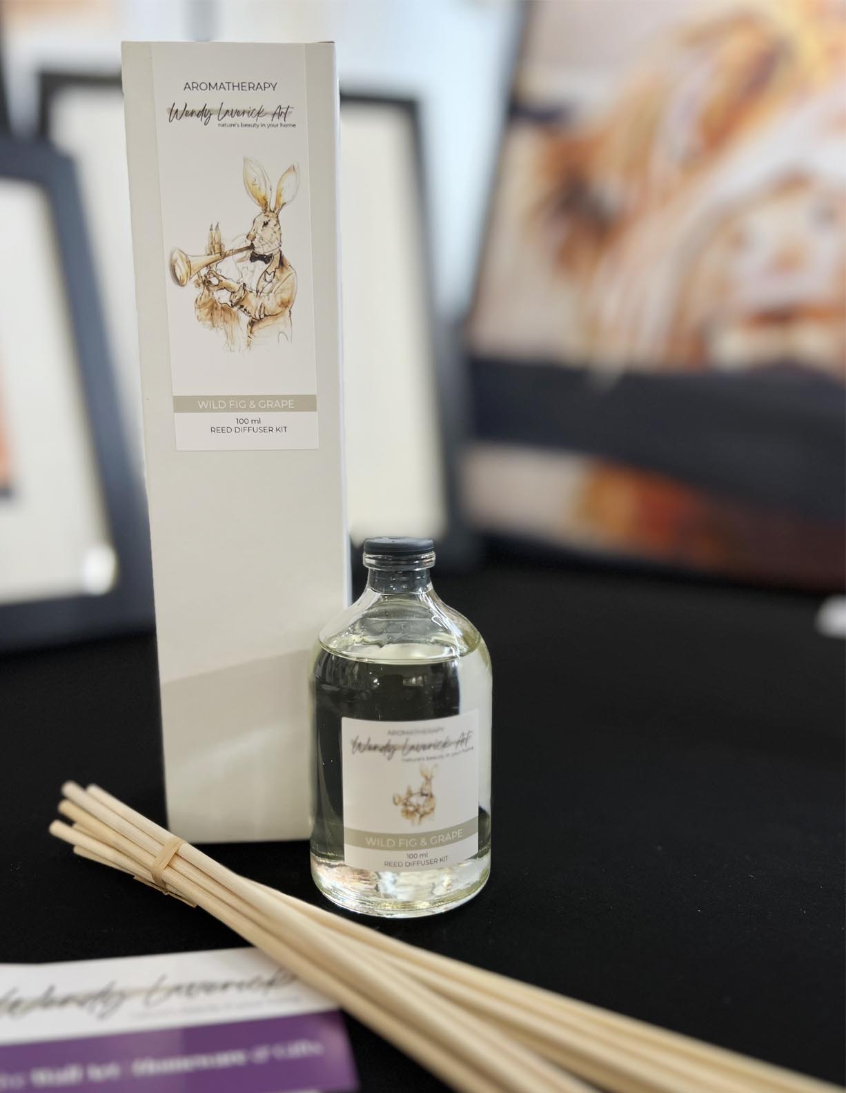 Transform your space with this exquisite aromatherapy reed diffuser kit, Wild Fig & Grape. The elegantly designed bottle showcases Wendy Laverick's charming artwork of Ronny Jazz the Hare, enhancing your home’s ambiance while infusing it with natural fragrance.