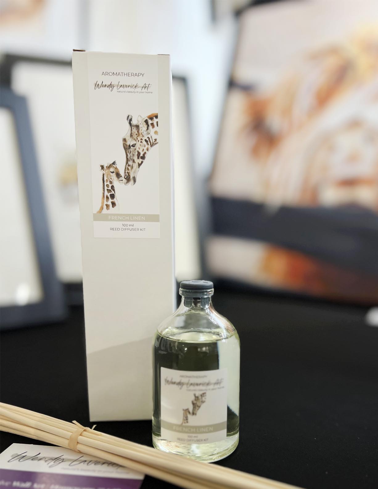 Transform your space with this exquisite aromatherapy reed diffuser kit, French Linen. The elegantly designed bottle showcases Wendy Laverick's charming artwork of the Lara & Baby Jerry the Giraffes, enhancing your home’s ambiance while infusing it with natural fragrance.